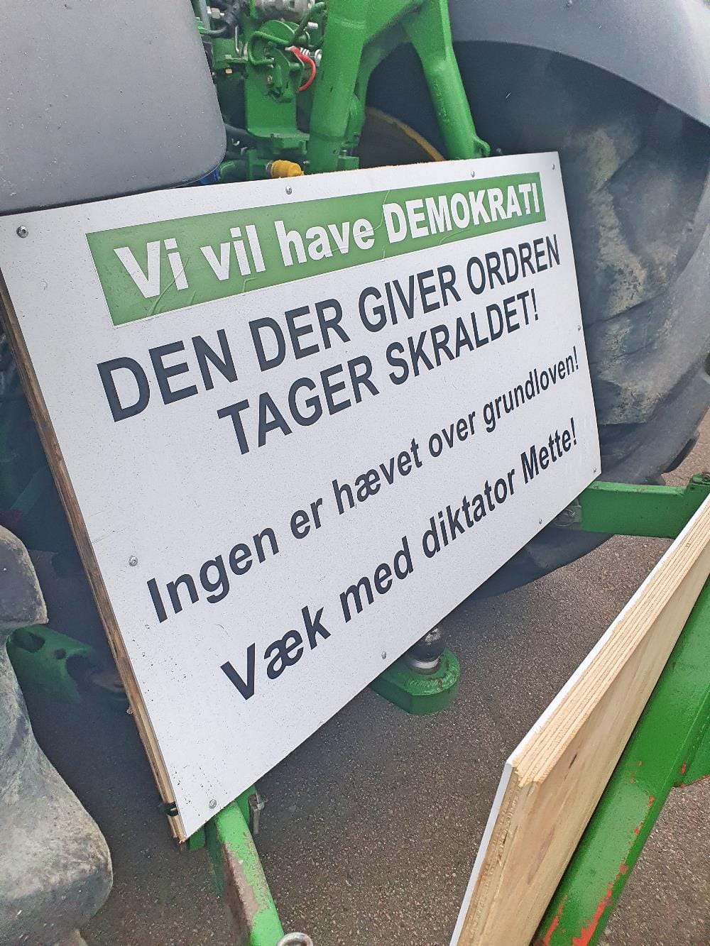 Den 21. november startede minkavlere og andre landlige ejendomsbesiddere ca. 800 traktorer og begav sig mod Århus og hovedstaden under vajende dannebrogsflag. I optakten havde de blandt andet turneret med et banner med Mette Frederiksen og Pernille Skipper i naziuniformer med påskriften: »Lystmorder! Løgner!« Andre prominente paroler til demonstrationerne var »NED MED DANMARKS BLODRØDE REGERING«, »Hvis magten er rød, er det landbrugets død!« og »Nutid, datid – Venstre altid«.